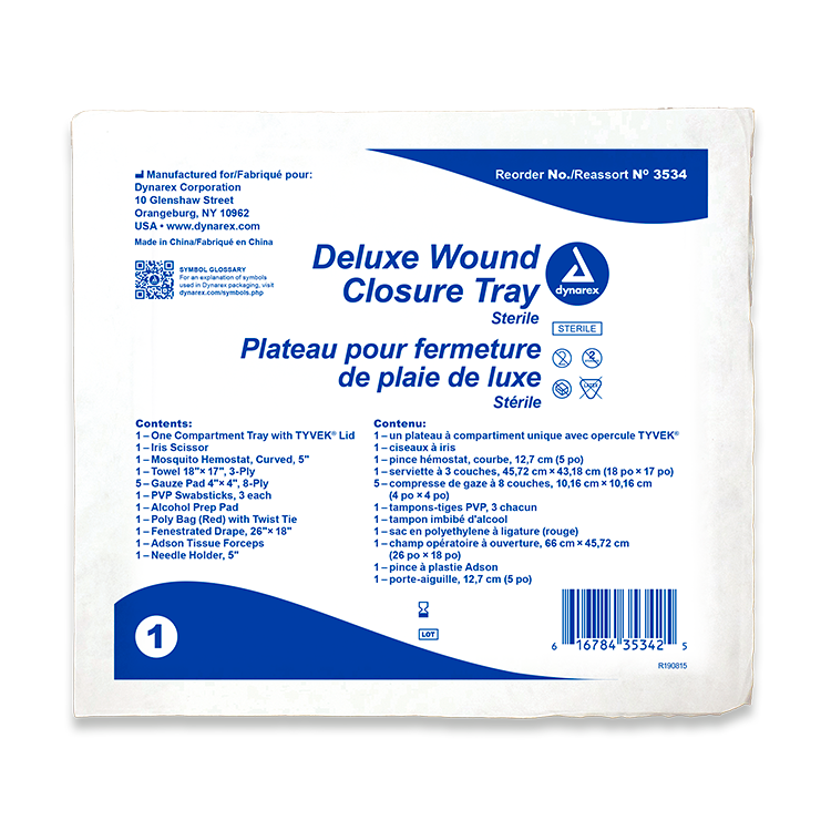 Dynarex Deluxe Wound Closure Trays contain all the necessary components to perform a wound closure procedure, all packed in procedural sequence.