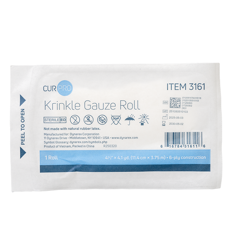 Dynarex Krinkle Gauze Rolls and Sponges are highly absorbent 100% cotton dressings designed to provide cushioning support and protection for sensitive wound areas.