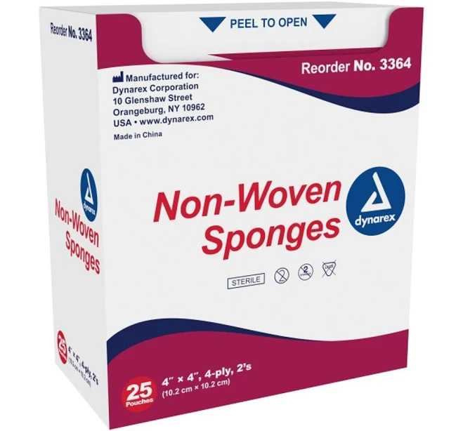 Dynarex Non-Woven Sponges are premium-quality, non-woven sponges designed for effective cleaning and wound dressing. Non-woven construction allows for less linting than standard gauze. This highly absorbent gauze is available in sterile and non-sterile varieties. Sterile sponges are packaged in peel-down pouches for convenient, aseptic handling.