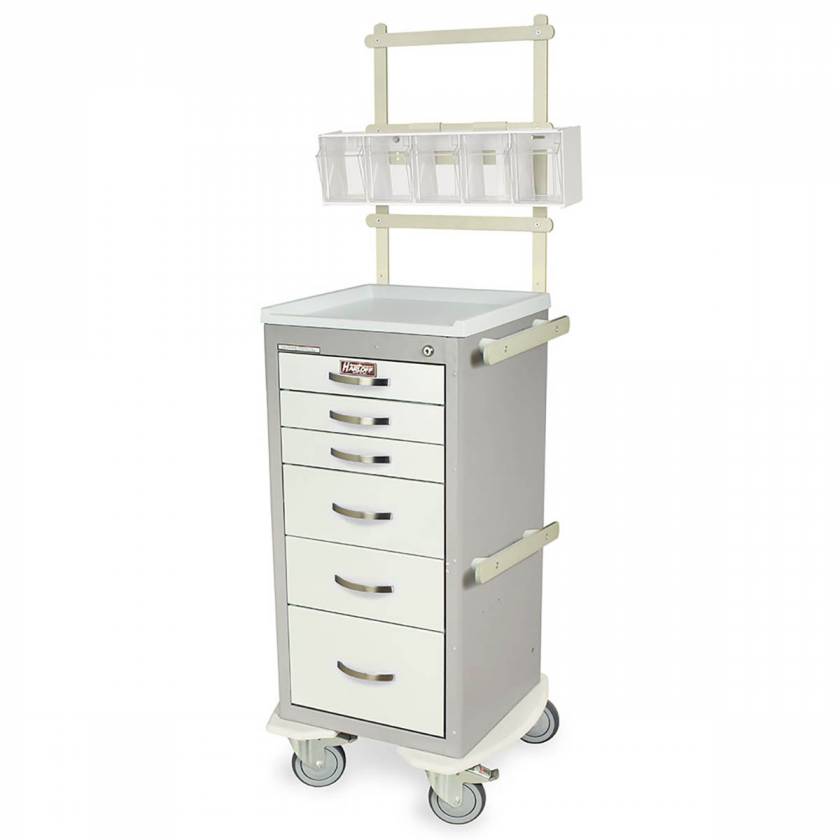 This light narrow anesthesia cart with accessories offers healthcare specialists a secure, mobile location to store essential anesthesiology supplies required to properly care for their patients. The cart’s lightweight aluminum build and narrow cabinet enable the cart to be transported quickly from one room to another while easily fitting into areas with tight spaces. Offering 30″ of vertical drawer space, this cart comes with an abundance of potential custom drawer configurations as well as customization options for locking style, color selection and accessory options. This cart can be of particular benefit to clinical facilities that offer drug or alcohol rehabilitation and behavioral and psychological centers as an abundance of supplies and medications can be safely stored within the key-locking cart’s six drawers. This light narrow anesthesia cart with accessories includes Harloff’s MD18-ANS Anesthesia Accessory Package which consists of a back rail, side rails and a 5-compartment tilt bin.